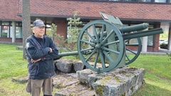 Raimo Soininen teki suurimman osan tykkien kunnostustyöstä Korvaluoman hallissaan. Kuva 5.8.2025 kaupungintalon edustalta tykin paljastustilaisuudessa.