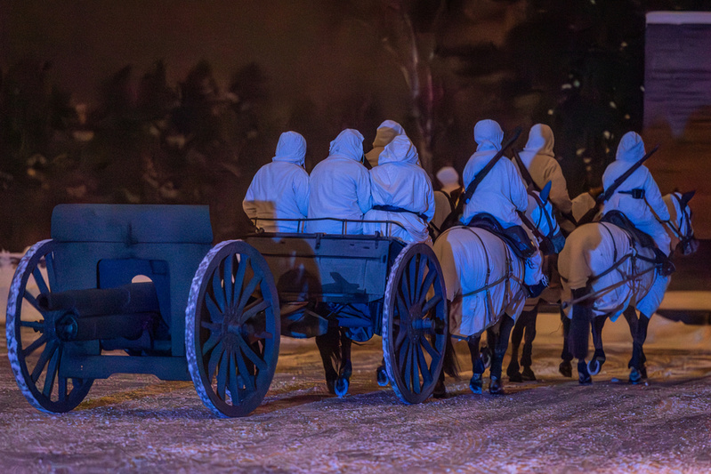Näytöksissä tunnelmaa luovat ratsureiden historialliset asusteet ja hevosilla menneen maailman varusteet. Ne on tehty Venäjällä 1900-luvun alkupuolella.