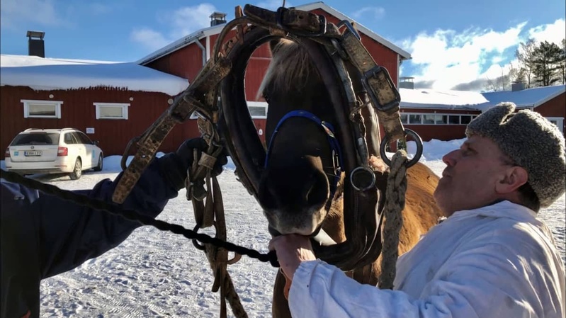 Ratsuri Matti Peurala selvittelee tottuneesti pian Sirpan pään yli vedettäviä kärkiparin valjaita Niinisalon Ratsastajien tallilla Kankaanpäässä.